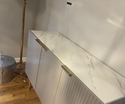 The sideboard cabinet is very cute! I assembled it by myself. Pretty simple. It is light weight and easy to move around. The gold accents match perfectly with the other decor I have. The white is a creamy pure white. I have not had any issues with scratches or marks. I would supposed this item is susceptible to water marks and the like. I would not place liquid on the top since it’s particle board. The one complaint I have is that the door handles never aligned. The middle door is slightly lower. I followed the instructions to make the adjustments but could not get it right. I would consider another piece from this manufacturer. I didn’t have any delivery issues.