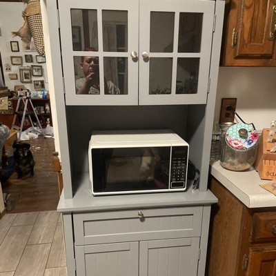 This looks fabulous in my home!! It’s the perfect size for my microwave, pots, and utensils!! I built it alone so it took me almost 4.5 hours to put together, but well worth it!!