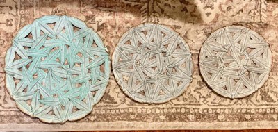 [This review was collected as part of a promotion.] Beautiful set of 3 tin pieces with a leaf design. They vary in color. The largest is a light minty green, the middle sized one is a darker green & the smallest is grey. They all have bronze tips on the edges. Lightweight & easy to hang.