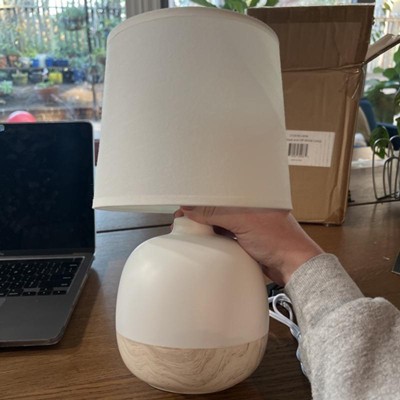 Needed something small to place on a shelving unit to light up small corner. This lamp is very nice. Not sure what the cream base is made of but it is nice and has some weight to it. I like the wood contrast agains the "ceramic" cream color.