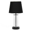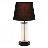 Why not have the best of both worlds with this metal and glass table lamp? This 16.93" lamp features a closed in glass cylinder base with painted black metal accents beneath a tapered black fabric shade. Perfect for those seeking a well balanced design amidst the ample light output. Note: The base is can not be filled by water or other products.