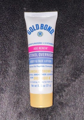 Gold Bond Age Renew Retinol Overnight has just the right ingredients in it , needed for it's performance. It also is has a great value to, that is just another one of its perks. It also is designed for longevity of your skin life to. It's great all the way round. You have to try it..