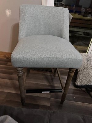 Elevate the look of your dining space with the Martha Stewart Delaney 25" Upholstered Counter Stool. Flaunting an elegant silhouette, this counter stool features an upholstered seat and back that contrasts the base, for a chic transitional look. The solid wood turned legs add a sophisticated touch to the design, while the metal kickplate on the footrest protects against every day wear and tear. This upholstered counter stool brings a perfect blend of style and comfort to your dining room.