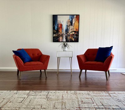 A lovely persimmon colored chair with a mid-century mod feel. It is comfortable for the small price tag. I find it is most comfortable with a stool about the same height in front of it.