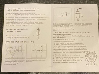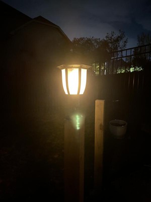 [This review was collected as part of a promotion.] I love the look of this solar light. Its very large, actually much bigger than I imagined it would be but I like the size. It was easy to set it up and I like that I can change it from Amber lighting to white lighting. BUT it's really more of a decoration piece because it barely lights up at all. I have it placed where it gets direct sun all throughout the day but still barely gives off any light at night. I had hoped to have a light source for my dogs when they are at the back of my yard but the tiny amount of light this gives off does absolutely nothing to solve that problem.