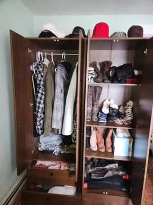 [This review was collected as part of a promotion.] I will admit that this wardrobe has been an awesome addition to my bedroom. It is ridiculously spacious but doesn't really take up that much room and it ties into the rest of the room nicely. There isn't a whole lot of hanging clothes area but, then again, we knew that going on. The shelves hold a lot and are spaced perfectly. The drawers hold a good deal as well. The only draw back to this entire operation is the assembly. There are SO MANY parts. It was crazy how many different screws there were. This is most definitely a 2 man operation if you want to cut down on the time it takes. If you're doing it yourself then you need to plan on setting aside 2.5-3 hours easy. And, if I can make a suggestion, separate the screws into different bags. Searching for the right one takes time and this assembly takes enough time as it is.