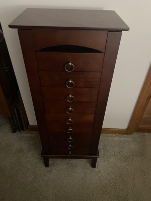I have a lot of jewelry so I finally decided to upgrade to a larger jewelry cabinet. This cabinet is very impressive. It looks like a fine piece of furniture and matches my decor perfectly. Huge storage capacity too. Beautiful wood finish with upgraded hardware. It was simple to assemble since most of the cabinet was already together. Even as someone who has never assembled furniture before, this was an easy task. The drawers glide smoothly and I love the side doors that allow me to hang my necklaces so that they don't tangle. All of the drawers are felt lined to provide protection for my jewelry too. My only suggestion would be to add something to make the side doors easier to open. Possibly a magnetic closure that will pop open when pressed since adding hardware would alter the nice lines of the cabinet. Beautiful jewelry cabinet that I would recommend to others.