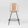 A: The barstool features a metal frame with a rattan-like woven seat and back.