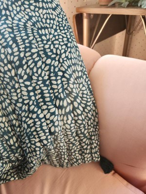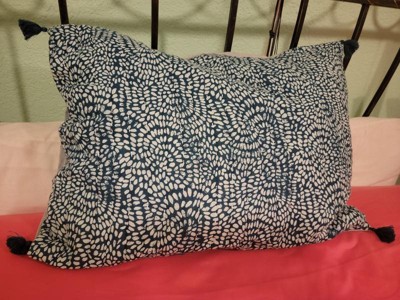 Fun fabric print and the tassels on the corners are super cute. The teal color is very nice and pops with many decore options. This is well made with envelope end to keep pillow inside. Soft and comfortable to lay on