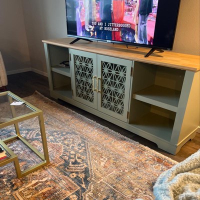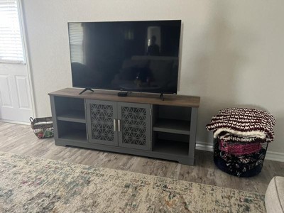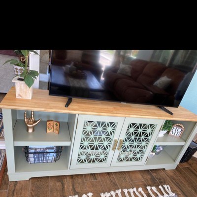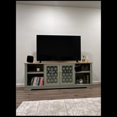 Decorative floral door 70 inch TV stand features swing door, and open adjustable shelf space. The cable management cutouts will keep your audio and video cables clean and tidy. Its ranch rustic style would perfectly match your current decor. Elevate your living room as well as your TV set with this beautiful TV stand.