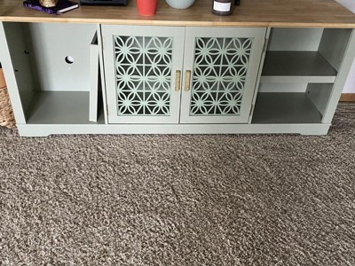 We love this TV stand! Here’s what you should know: Color-wise: it’s more of a muted sage than in the picture online, which we were really happy about! It matches a lot better than we thought. I’ve shared two pictures, one in the evening and one in the day with bright light. Assembly: it took about an hour to put together. Assembly was easier than most furniture I’ve put together. Weight: heavy! This thing is sturdy. The top base and shelves are not real wood, but we feel confident putting our TV and books on it. Affordability: for this large and sturdy of a piece, we were surprised by the cost. It’s definitely worth the price!