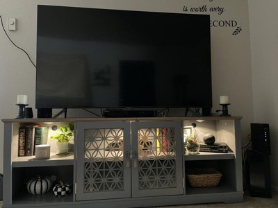 This TV stand impresses with its beautiful color and sturdy design, making it a stylish addition to any living room. Guests appreciate the adjustable shelves and the elegant glass doors, which enhance its aesthetic appeal. While assembly can be time-consuming and some pieces may arrive with minor damage, the overall quality and value make it a worthwhile purchase. Many guests recommend it for its affordability and attractive look.