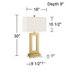 Modern luxe gold table lamp with rectangle design. From the 360 Lighting brand. Gold finish open lamp base. Metal construction.