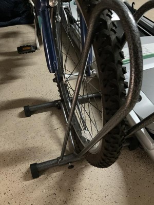 Purchased this stand to use in my apartment to hold up my bike. The stand is sturdy enough to keep my bike upright without worrying it may tip over.I also like that the rubber feet do not mark up the wood floors. Quality product.