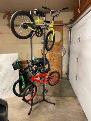 This bike rack was really easy to assemble and can be adjusted to accommodate bikes of different sizes. It's best to keep larger bikes on the lower level. There is a handy basket to hold bikelocks or extra items.