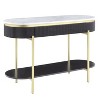 This trendy faux white marble sofa table establishes a mid-century modern plan with a chic gold twist. It's the perfect entryway console table as it stands stylish on its own. The table offers a concealed drawer as easy storage for your keys and mail and an open lower shelf displays decor. Detailed ridges of the rounded body are smart and practical.