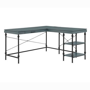 Tuck this L-shaped desk in the corner to establish a modern farmhouse-style home office. The black steel frame is fashioned with turned knots and crossbars for a subtle class. This frame holds one drawer on smooth ball bearing glides, charging ports, and two shelves. To top off this desk are two power outlets and two USB ports that will keep all your devices easily charged and powered.