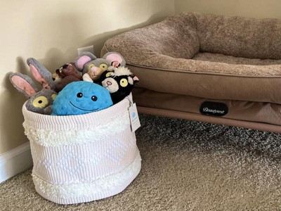 This beautifully well made basket is great for any room. From holding towels and burp cloths to toys and so much more! It is not too big or too deep and have found it to be the perfect size to hold my dogs toys upstairs next to his bed. It is nice to finally have a place to put them that is also beautiful. This cloth basket is easy to spot clean and I prefer it over a wooden basket because those tend to break down so fast.