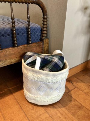 - Tufted fabric round storage bin