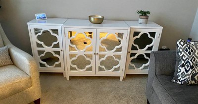 This cabinet is gorgeous! I purchased this in white with the silver mirrored door. It is larger than what I anticipated in the space, but it fits and looks great! The materials are high quality, solid and the glossy finish really looks high end. It took 2 people about an hour and a half to put this together. My only recommendation is that Target offer an option to pay for one of thier people to put it together.
