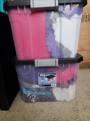 [This review was collected as part of a promotion.] I love these totes. They are made of durable material for the Florida heat when I put them in my garage or storage unit. I love the clasp and that you are able to stack them for more use of vertical storage.