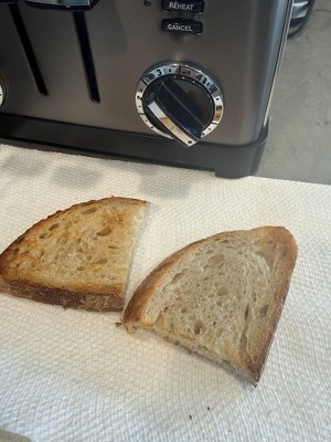 The stainless finish on the top of the toaster between the bread slots is blistering from the heat. It toasts great. Bread is evenly toasted. Faster than our old toaster. But I am not happy about the damage to the finish after one cycle.