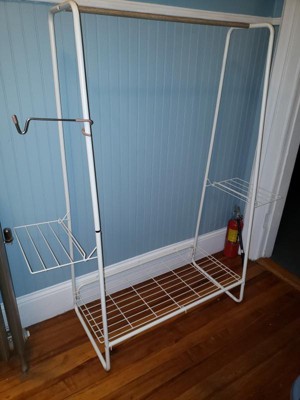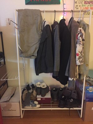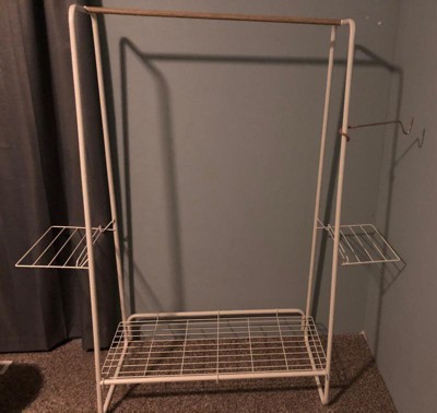 [This review was collected as part of a promotion.] This garment and accessory rack is great and helps keep my room organized, while giving me extra room for my clothes . I have it set up in the corner of my room next to my small closet with my work clothes on there. I also like how it has the extra hanging rack, hook for my bags and bottom shelf to put shoes or boxes there. It's sturdy and holds up well with the clothes hung. It's pretty good quality and easy to assemble. It's also perfect for hanging delicate garments after washing to dry them and/or to steam them.