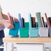 Keep folders, magazines, worksheets, and more organized with the Linking Book Bins. This 10-pack of connecting plastic storage bins keeps reading corners, playrooms, classrooms, and kids' bedrooms clutter-free. Each vertical storage bin has a deep interior to accommodate letter-sized files, folders, and books standing upright for office organization. The open design allows easy access to art materials, homework, and books facilitating quick transitions. Book tubs have interlocking sides to link multiple bins together for stability, organize neat rows, and create a customized storage system to accommodate various learning environments. Label bins to identify contents such as “homework assignments” or book genres. Introduce individualization in the classroom and personalize each student’s bin with pocket labels for easy identification, sold separately. Educators can easily move the book bins with built-in handles on the front and back allowing for easy gripping for transporting. When empty, book storage can be nested for space-saving storage and to save valuable classroom space. Book boxes are made of durable plastic that is easy to clean and designed for everyday use for classroom organization and perfect for home storage.