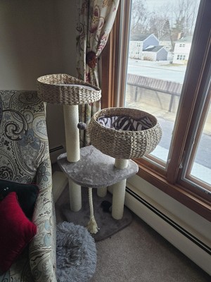 This is a nice cat tree. We have adult cats and it\'s a little hard for them to maneuver the platform. I ended up putting the big basket on the top pole so they can jump from lower basket to bigger one. Definitely solved the problem. Love the 3 sisal poles. More options for them to claw at them. The tree is very sturdy.