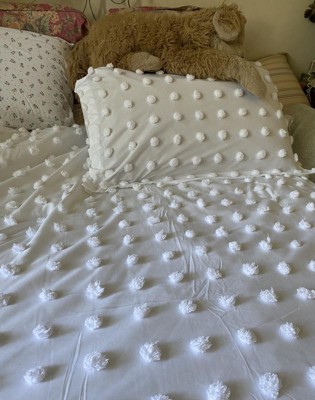 [This review was collected as part of a promotion.] This soft, pretty comforter is the kind of bedding that updates the look of my entire bedroom. The bright white-on-white fabric with whimsical pom poms is such a clean look, and this set is beautifully made. I was worried that the pom poms would come off but they’re securely fastened and add such a pretty texture. I washed the comforter and pillow case and they came out of the wash fluffy and perfect. Note: the comforter and sham feel like cotton but are actually made of 100% polyester fabric; the front is slightly textured, and the back is silky smooth. The comforter is stuffed with 100% polyester filler, which is lightweight and warm. I love that the comforter comes with a matching pillow sham, which ties everything together. Wonderful design and quality workmanship!