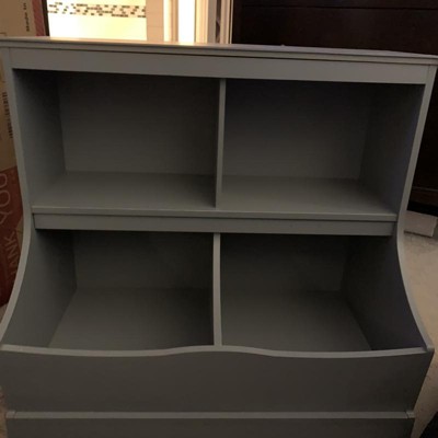 Overall, we decided to keep this product because we need the storage and it would have been too frustrating to disassemble it after having finally assembled the product. I wish I had continued searching for a storage solution instead of settling on this one. Cons: The directions are absolutely terrible! Tiny diagrams with no captions or written directions of any sort! At least give a sentence or 2 to go along with the microscopic drawings. The assembly ended up taking over 1 hour, with multiple trials and errors because we had to guess on steps due to inadequate directions. The material seems durable for light use, but it’s too flimsy to withstand the regular play habits of toddlers. There are some pieces that wiggle despite my husband tightening everything twice. We had bought this with the intention of using it in the playroom, but instead it went into an older child’s bedroom where it sees less traffic. The material gets scuffed and scratched easily, but the gray color hides the marks okay. Pros: The base appears stable enough that it won’t topple over easily. The gray color is true to the picture online. The ample storage is easily accessible for toddlers. The backing is a thin piece of “wood”, which will hopefully hold up better than some of the cardboard-type backing on similar products.