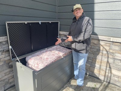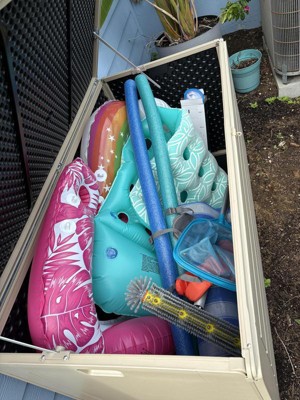 I’m looking to return this. The floor section of this storage box is very thin plastic. Not sturdy like the walls or top. Very disappointed with the quality of that one piece. It’s very important that it be heavy and sturdy as it’s outside near an in ground pool area and with a heavy wind this will go flying! Also, the color is gray, not black as described.