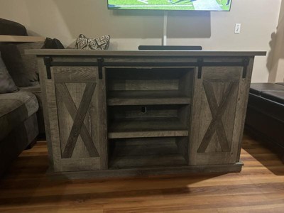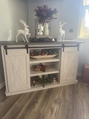 With its two-tone finish, cross-buck details and authentic charm, the Dorrinson TV stand is right in tune with your relaxed approach to high style. Beautifully made to accommodate your media equipment, it’s well equipped with adjustable shelving, cutouts for wire management and, of course, a pair of sliding barn doors you can center or place to the side. What a mastery in modern farmhouse living. Signature Design by Ashley is a registered trademark of Ashley Furniture Industries, Inc.