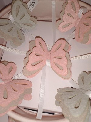 [This review was collected as part of a promotion.] I love the lambs & Ivy Baby Blooms Pink Butterfly Musical Baby Crib Mobile Soother it is so beautiful it fit my nursery aesthetically great quality well build very easy to install. There are five butterflies with layered wings in pink, taupe and gray. It spins slowly while playing nursery songs for 20-minute sit plays Brahms Lullaby, Twinkle, Twinkle Little Star, and Rock-a-Bye-Baby also has an on/off switch and volume control it requires 3 AAA batteries.