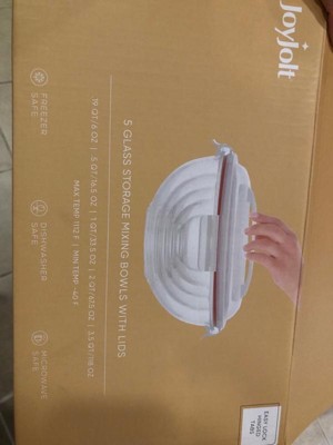 [This review was collected as part of a promotion.] Joyjolt glassware I have never heard of before. I am in love with this bowl set with airtight lids. Set of 5 Glass Mixing Bowls with Airtight Lids. Comes with these sizes 3.75 qt (120oz), 2.1 qt (67.2oz), 1.1 qt (35.2oz), .5 qt (16oz), .2 qt (6.4 oz) that are neatly nesting design for space saving storage and a carry handle on the biggest bowl of Lead-Free Borosilicate Glass. They are BPA-Free Lids with removable Inner lining and are fridge safe (Glass Bowls and Lids) I put chili in mine so far and chicken cooked and macaroni salad and baked beans. My food stays fresher longer. I recommend these because they are durable and wash up well. Very versatile and love the sizes.