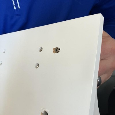Came with plastic bolts stuck in the screw holds. Couldn't get those out, after much pulling, i was afraid i was going to break the wood, so I had to use a knife and saw them off. Then, after getting the unit ready and installing the anchors, the screws went straight through the wood and the shelf fell. Bad unit, bad packaging, shoddy craftsmanship.