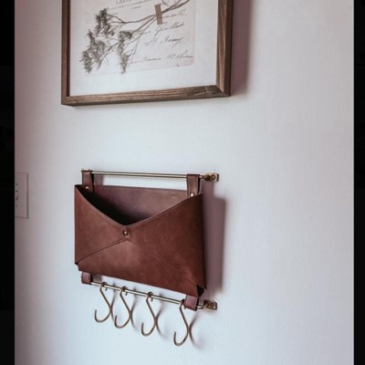 Entryway Organizer Faux Leather and Gold - Threshold™: Wall Mounted Mail Holder with Hooks, Brown, 14" Length