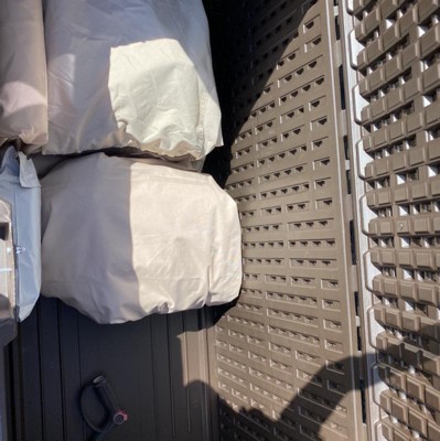 I bought this to keep towels, cushions, and spa chemicals in. Based on the description it was exactly what I needed. It was easy to put together and was received undamaged. Unfortunately, the top doesn’t line up with the base so it doesn’t close flush, and when the top is opened when wet all the water from the top goes inside, making this a big waste of plastic that is not serving the purpose for which it was purchased. Of course, I don’t have the box to return it.