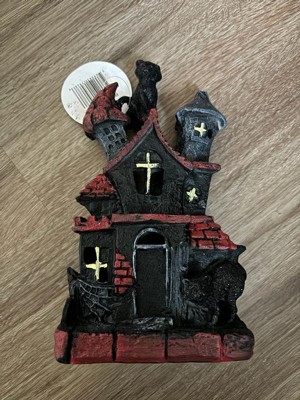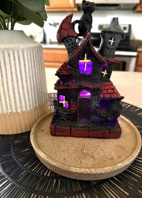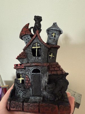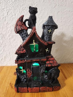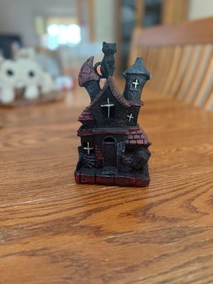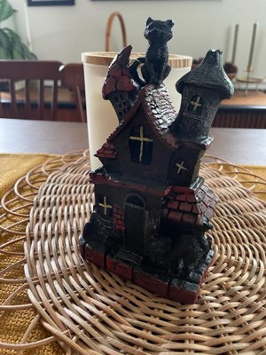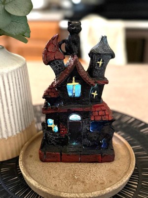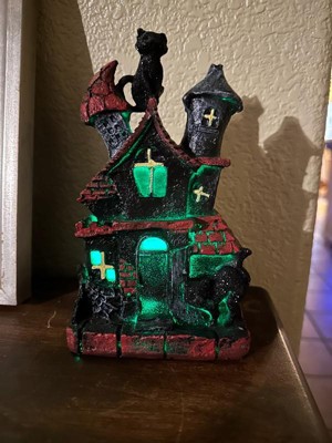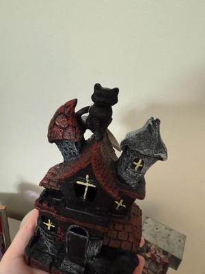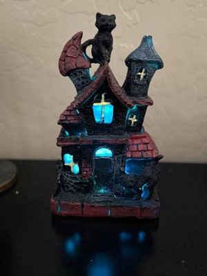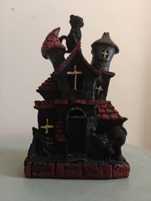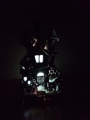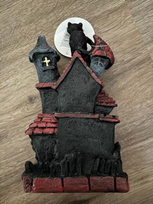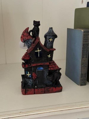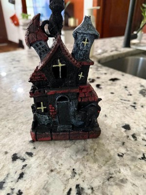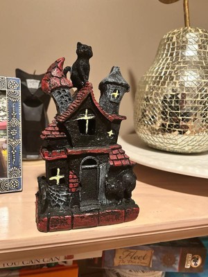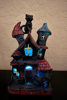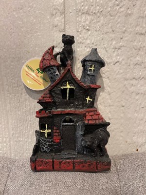 [This review was collected as part of a promotion.] This is absolutely adorable! I’m a cat lover so the black cat is the perfect touch to this haunted house. It’s very lightweight and made of sturdy polyresin which is great for no worry storage during “off season”. The battery operated light feature adds a cute spooky touch. Great addition to my Halloween decor!