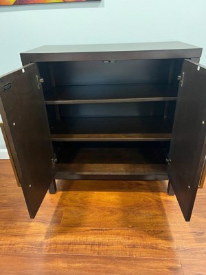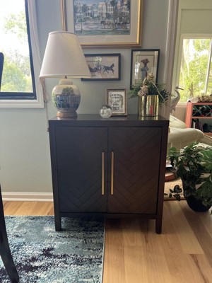 I bought this cabinet for my guest bedroom. I have a 19" flat screen tv setting on top of it and I use the shelves to store my granddaughters books and some legos for when she is here. It is a nice modern/transitional style. The chevron pattern on the doors and the brass handles make it look expensive. It came in very good shape. My son-in-law put it together with a couple sizes of phillips head screwdrivers in about an hour. Only issue is that screws for the back panel did not have holes pre-drilled for them. With a little elbow greese he was able to insert the screws as the wood was soft enough. It is very solidly built. Only ding was on an interior side panel which does not show. It is a dark walnut. I would recommend.