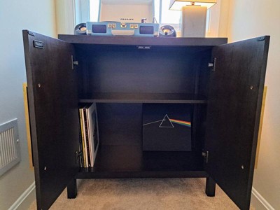 [This review was collected as part of a promotion.] This piece is the perfect table for my record player. It is a very handsome piece with a warm but modern look. The quality is even better than I expected. There is ample storage. It can hold far more records than I own. I took approximately 2 hours to put together by myself; I would recommend having someone help while you put the doors on. You may notice that the gaps between and around the doors are skewed. DONT PANIC! Each hinge has two different adjustments. I recommend reading the instructions while adjusting to make it quick and easy.