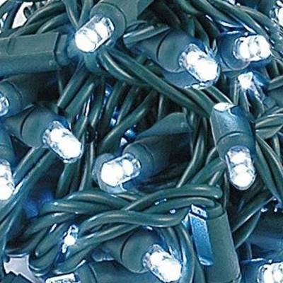 Our super bright green wire 50 light wide angle mini lights have 50 commercial grade LED bulbs on 6" centers making each string 25' long. These strings have non-removable LED's that eliminates failures from loose, broken, or removed bulbs. These commercial grade LED Christmas lights are very durable, long lasting, and extremely energy efficient. Each string is full wave rectified which eliminates any flickering while making these LED Christmas lights brighter than ordinary LED mini Lights. Each LED uses a patented concave design making these LED viewable from all angles. UL listed for indoor and outdoor use. Connect up to 43 strings end-to-end.