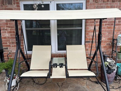 - Extra Storage Space: This outdoor porch swing chair has a tempered glass table with 2 cup holders. Along with the extra storage shelf beneath the tabletop, the patio loveseat swing is able to hold outdoor essentials, such as drinks, cellphones and magazines for easy access.