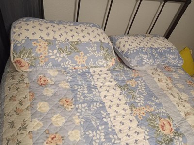 [This review was collected as part of a promotion.] This perfect three piece reversible quilt and pillow shams looks wonderful in my mother's bedroom. The blue and pink colors really bring out the brightness of her room and matches her older cottage style decorating perfectly. She loves the quilt and the shams. They're very easy for her to wash and hang up to dry. They pair well with a light yellow color as well.