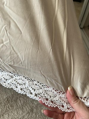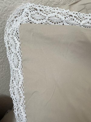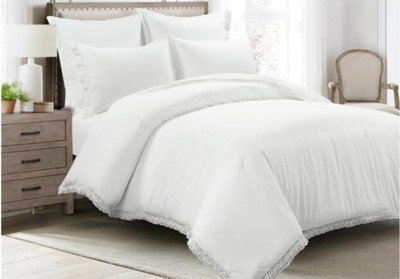 [This review was collected as part of a promotion.] I got this in the bleach white set. I love it. It’s very comfortable to lay on and looks great and elegant in my nautical room. It really brightens the room and I love how soft it is. I wasn’t too sure about the lace trim but it’s very subtle so it looks nice. I have not tried washing this yet.