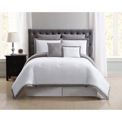 [This review was collected as part of a promotion.] I got the Rosalie Light Grey 5 piece comforter set. It came with 1 comforter and 4 pillow shams (2 standard, 2 king). It is a basic grey comforter will very pretty lace edging. The lace is rather dainty and I wonder how well it will hold up in the wash. We have not tried to wash it yet. It is soft, and comfortable. It looks aesthetically pleasing on the bed and adds to the décor of the room. We have the King, and my only complaint is that I feel it is better suited for a queen. Reason being, it is not long on the sides to hide the mattress when the bed is made. Overall, this is a great practical comforter set and I am pleased with the way it looks and feels.