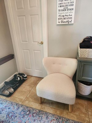 This Sculpted Faux Shearling Accent Chair Threshold™ designed with Studio McGee is sooo stylish! The cream color is super pretty in person! I really like how it has a sculpted look, it elevates the piece to a new level. It has a nice wide seat surface area so it’s perfect for curling up on to use your phone or read a book, etc. it’s also the perfect height! I don’t feel like I’m falling into as a sit..lol The Sherpa material is so underrated. It looks so nice on this furniture piece. It’s fits so well with any color theme you may have in your home. It’s quite neutral. I have it paired with an ottoman and it looks so good!