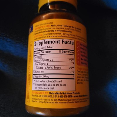 Nature Made L-Theanine 200mg chewable tablets help relax the mind without causing drowsiness for fast-acting stress relief (1). L-Theanine is an amino acid that quickly helps you manage stress in the moment. These L Theanine chewables come in a delicious tropical fruit artificial and natural flavor and have no color added, no dairy, and are gluten free, 100% drug free, and suitable for vegetarians. Adults, chew one L Theanine tablet per day as needed. Start your day with Nature Made L-Theanine supplements. (1)Works within 30 minutes. *Based on a 2022 survey of pharmacists who recommend branded vitamins and supplements. These statements have not been evaluated by the Food and Drug Administration. This product is not intended to diagnose, treat, cure or prevent any disease.CAUTION: Do not take more than 1 serving per day. If you are pregnant, nursing, have a medical condition, or are taking medication, consult your physician before use.These statements have not been evaluated by the Food and Drug Administration. This product is not intended to diagnose, treat, cure, or prevent any disease.