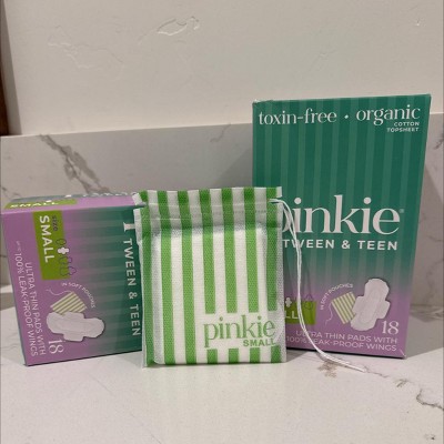 We ordered a few boxes of Pinkie after seeing an ad on Instagram for my daughter (12 years old) who just got her period this spring. The small size fit her perfectly and we plan on trying to regular size next. The baggies that they come in feel more luxurious than the regular pad wrappers I was used to when I first got my period. So happy I found Pinkie!