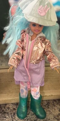 [This review was collected as part of a promotion.] This is a super cute doll outfit. It can workout for your regular sized Barbie just not the boots ha! The boots are glittery which is cute and fun for little girls. The jacket is shiny rose gold color on the top and and pastel purple on the bottom. Great color choices. The pants are cute with peace signs. The hat is too big for Barbie as well so has to be used with the 14” dolls intended for. My daughter loves the outfit and dressing her toys up in it.